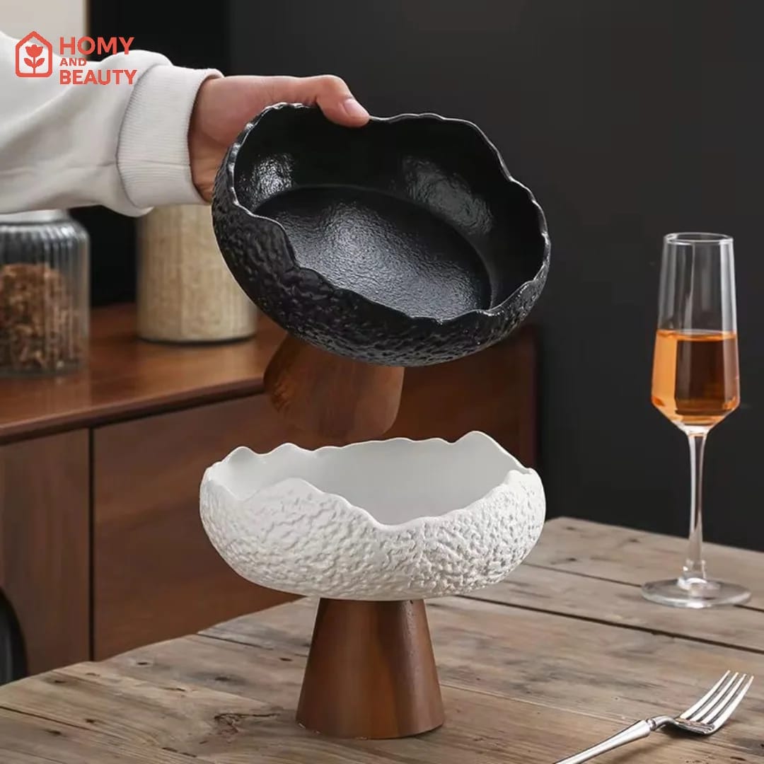 وعاء تقديم سيراميك بتصميم راقي مع قاعدة خشبية أنيقة 🍃